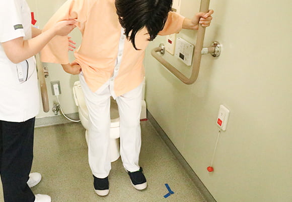 排泄は、移乗能力だけでなく、車いすや歩行補助具の操作やドアの開閉、立位での下衣操作など、一連の動作の獲得が必要です。 自立度評価表を用いて、多職種で排泄の自立度を評価し、安全に移乗やトイレ動作を行えるよう支援しています。